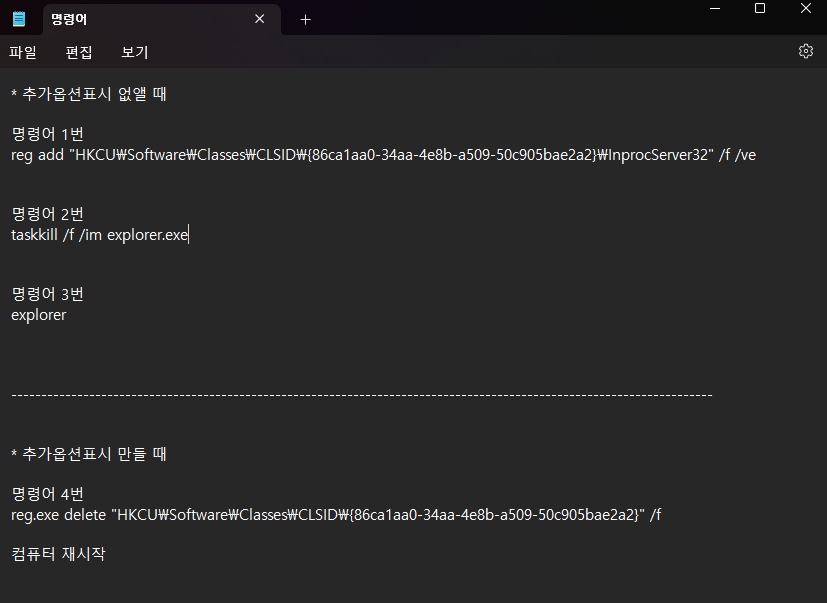 * 만일 추가옵션표시가 생기게끔 윈도우11 설정으로 되돌리고 싶다면